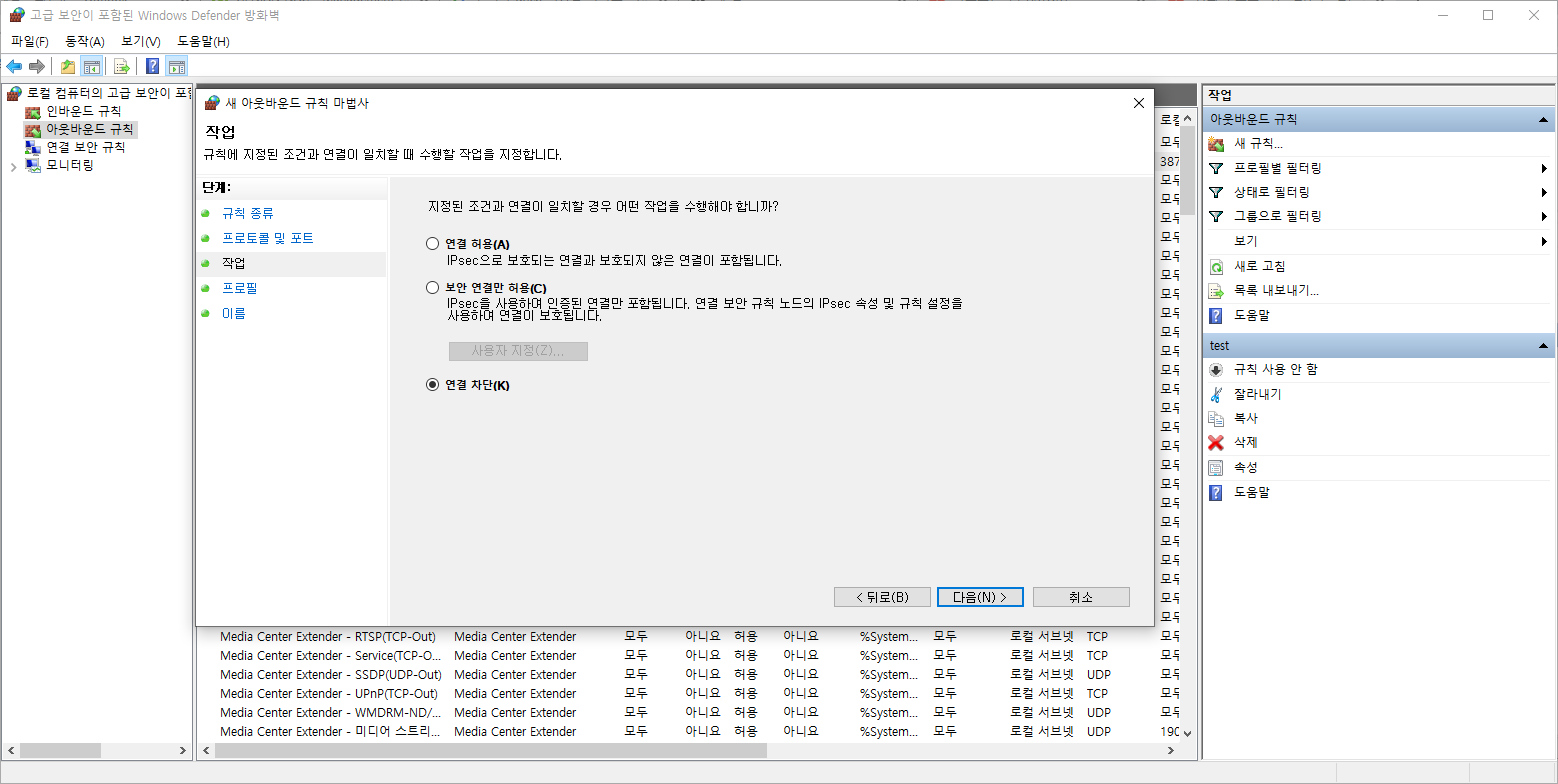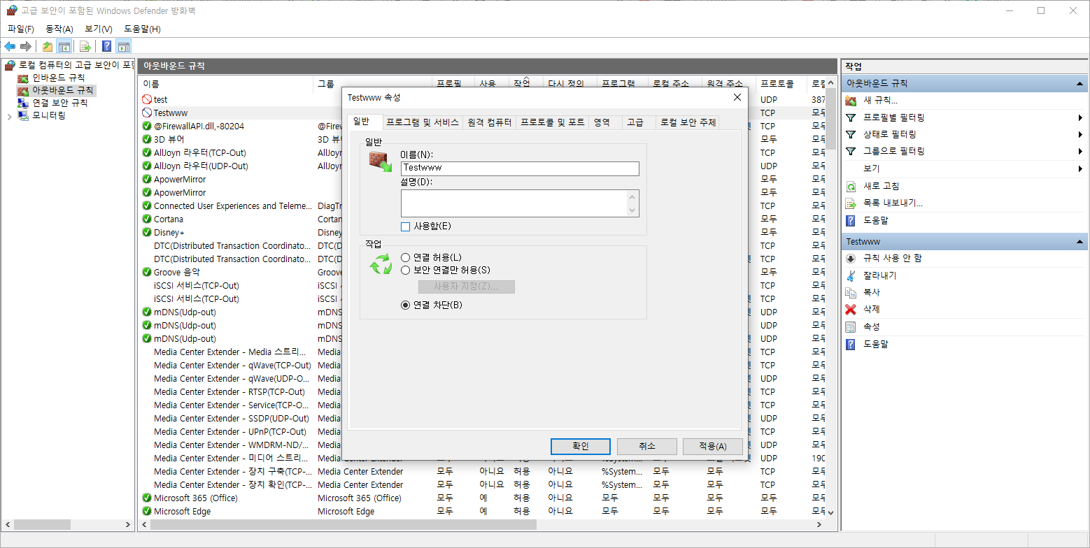 아웃바운드 규칙으로 거부 규칙을 만들어보도록 하겠습니다.