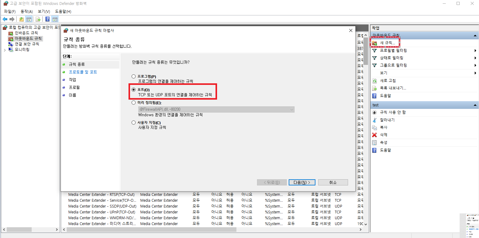 새 규칙 > 포트 를 선택해주시고 다음을 눌러주세요