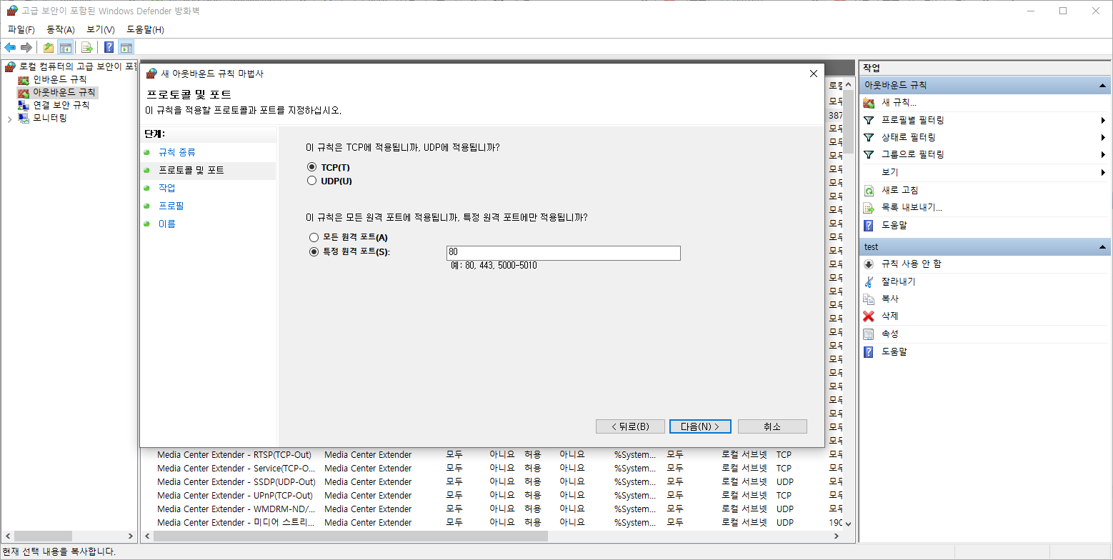 특정 원격 포트에 HTTP 프로토콜의 포트인 80 을 입력해주고 다음을 눌러주세요
